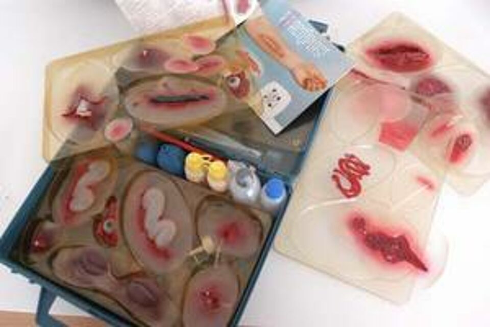 Eine andere Richtung erhielt die RUD im DRK der DDR mit dem Vorschlag von Herrn Werner Stammberger vom 3.11.1973 zur Herstellung von Wundmoulagen. Diese dünnen Gummiapplikationen wurden maschinell produziert und mit Hand bemalt. Sie kamen in Verbindung mit den bis dahin üblichen Schminkmaterialien zum Einsatz und sollten dazu beitragen, in kurzer Zeit mit möglichst geringem Aufwand viele Verletzte als Darsteller*innen vorzubereiten.